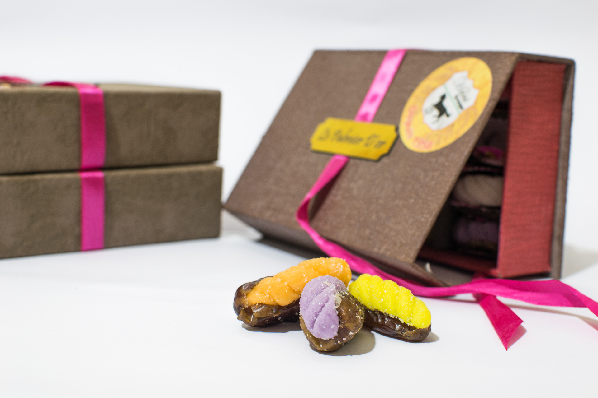 Un assortiment de dattes fourrées aux fruits secs (amandes, ) et bouchées de pâte de dattes avec des noisettes enrobées de sésame, présentées dans un écrin prestige.